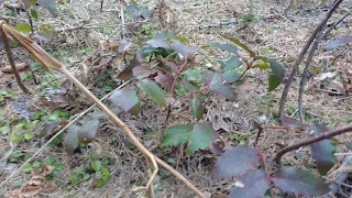 There is a patch of creeping mahonia in the old skid trail. <I>Mahonia repens</I> is the short version of Oregon grape. I had just enough from the patch by the back drive to make a tiny jar of jam the first summer we were here. See the flower buds starting to form? They'll be bright yellow soon, then develop into blue colored elongated berries with no crown (that circle on blueberries).